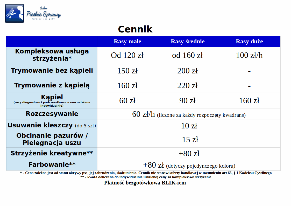 Jeśli i Ty kierujesz się podobnymi wytycznymi szukając odpowiedniego psiego fryzjera i chcesz , aby Twój pies po strzyżeniu wyglądał nienagannie - trafiłeś idealnie. Salon Pieskie Sprawy zaprasza !!!